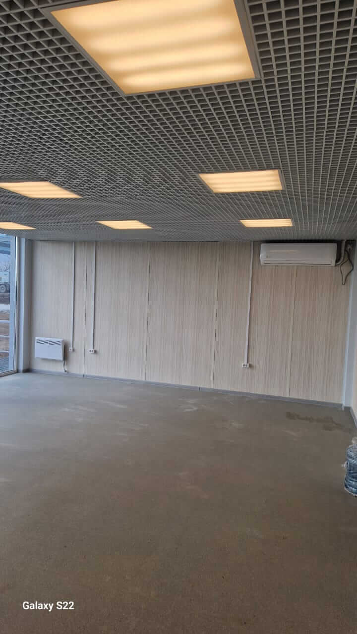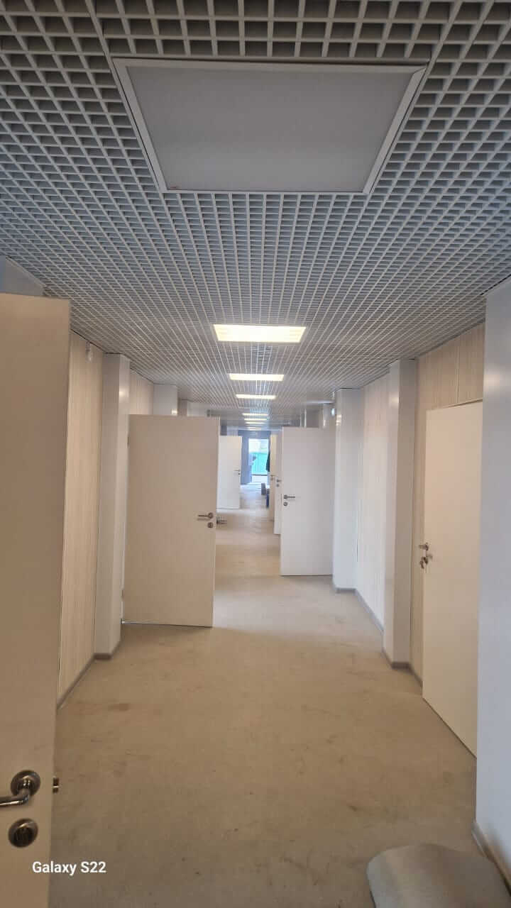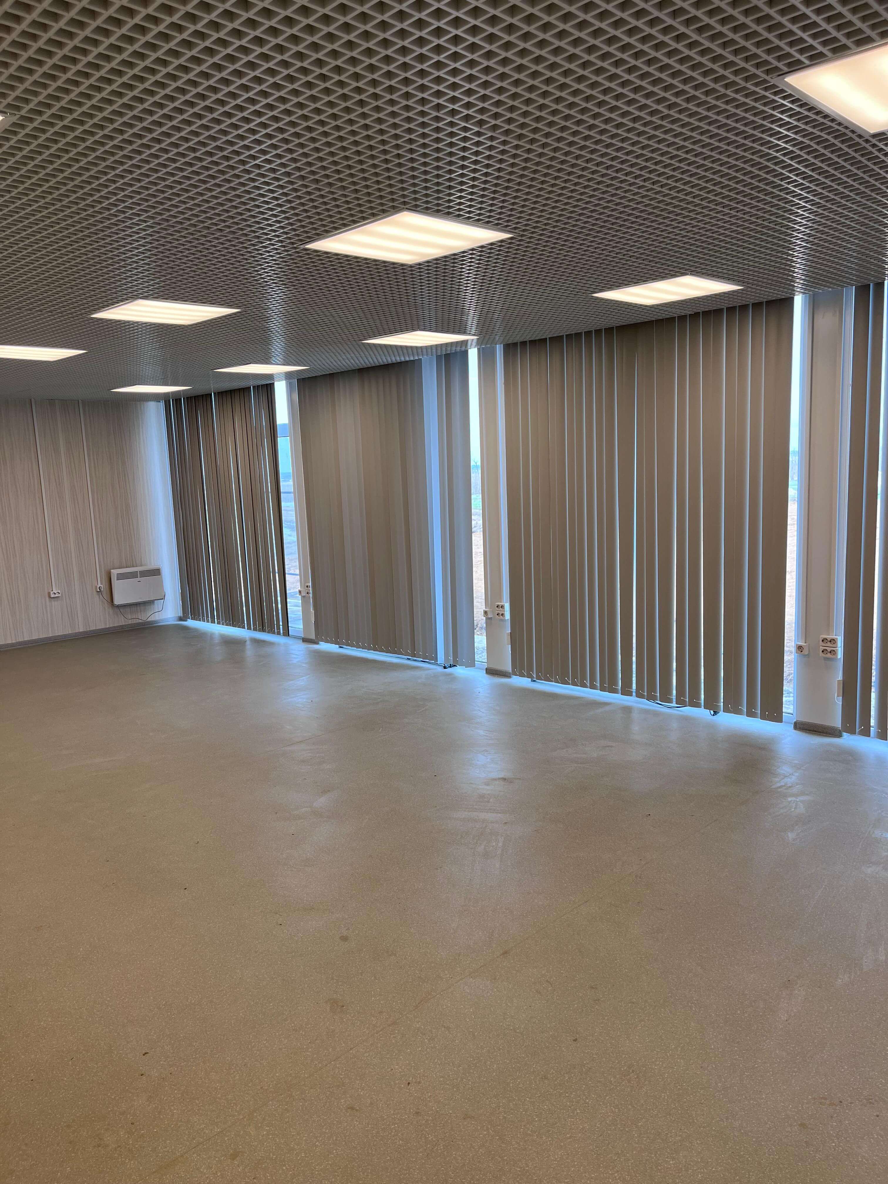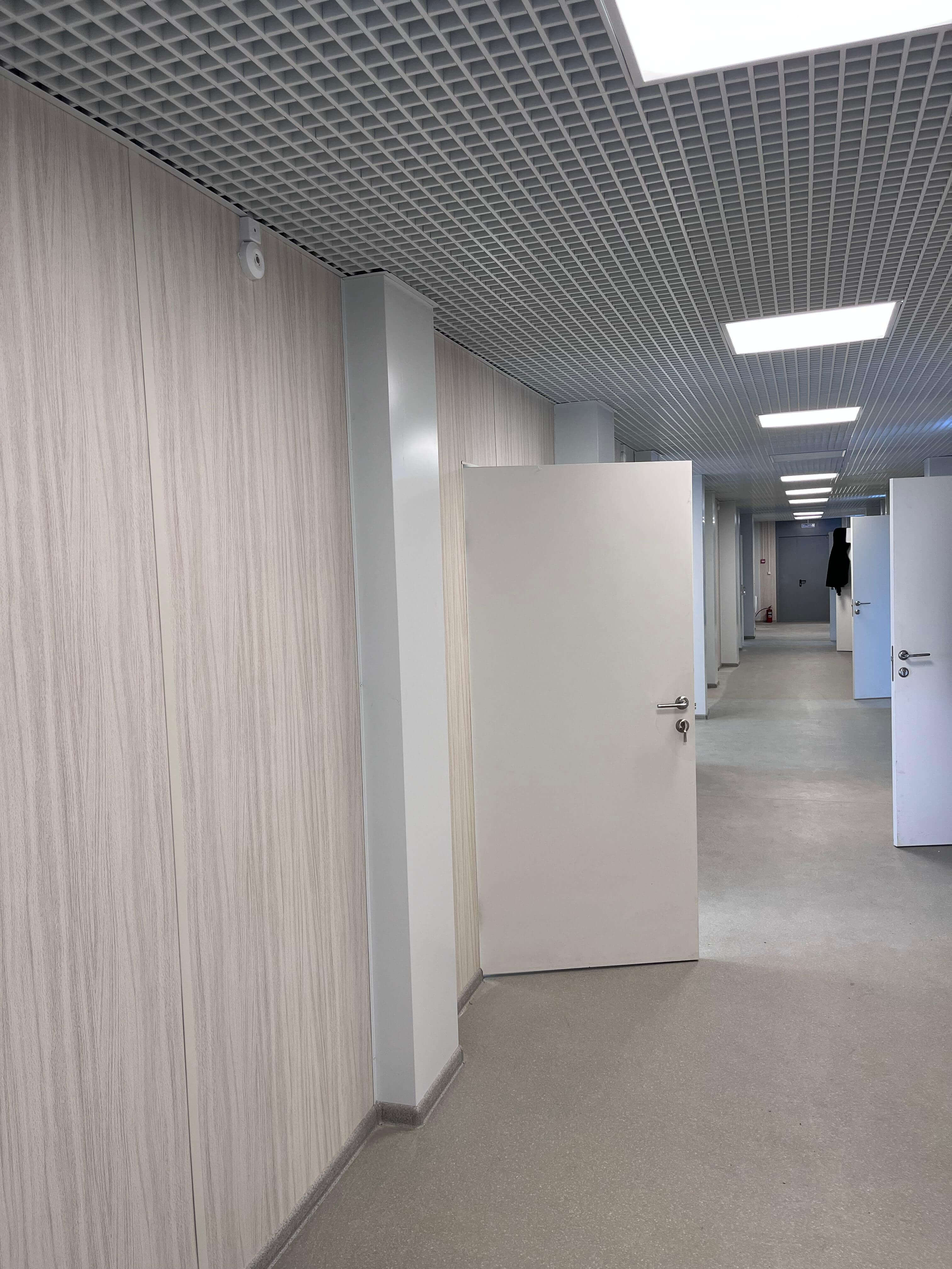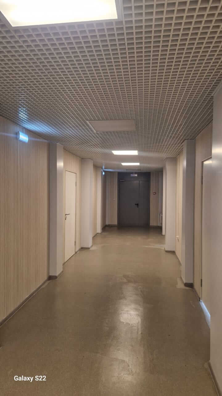 • Потолки: Установлена подвесная система «Грильято», обеспечивающая эргономичное размещение коммуникаций и равномерное освещение.