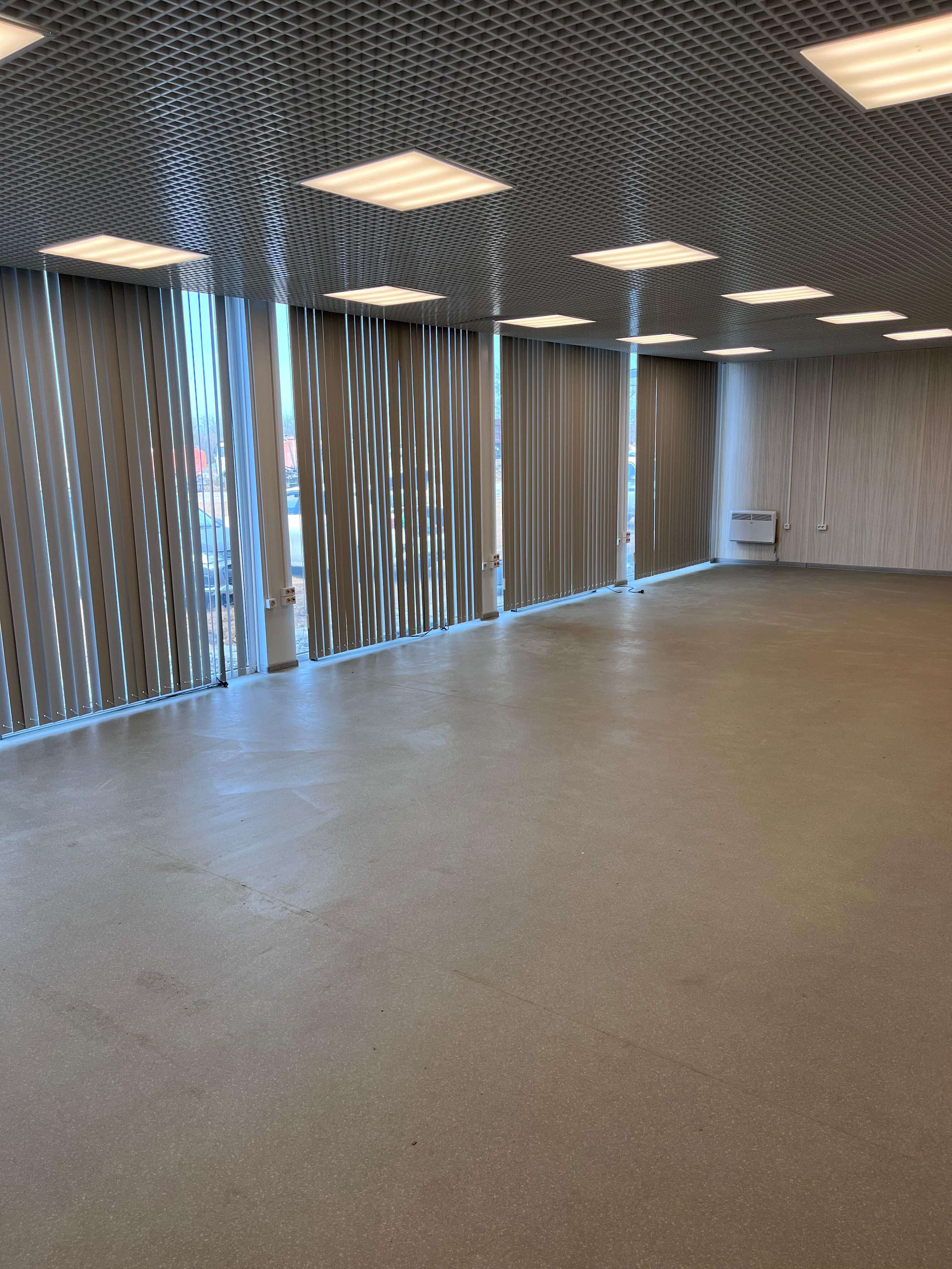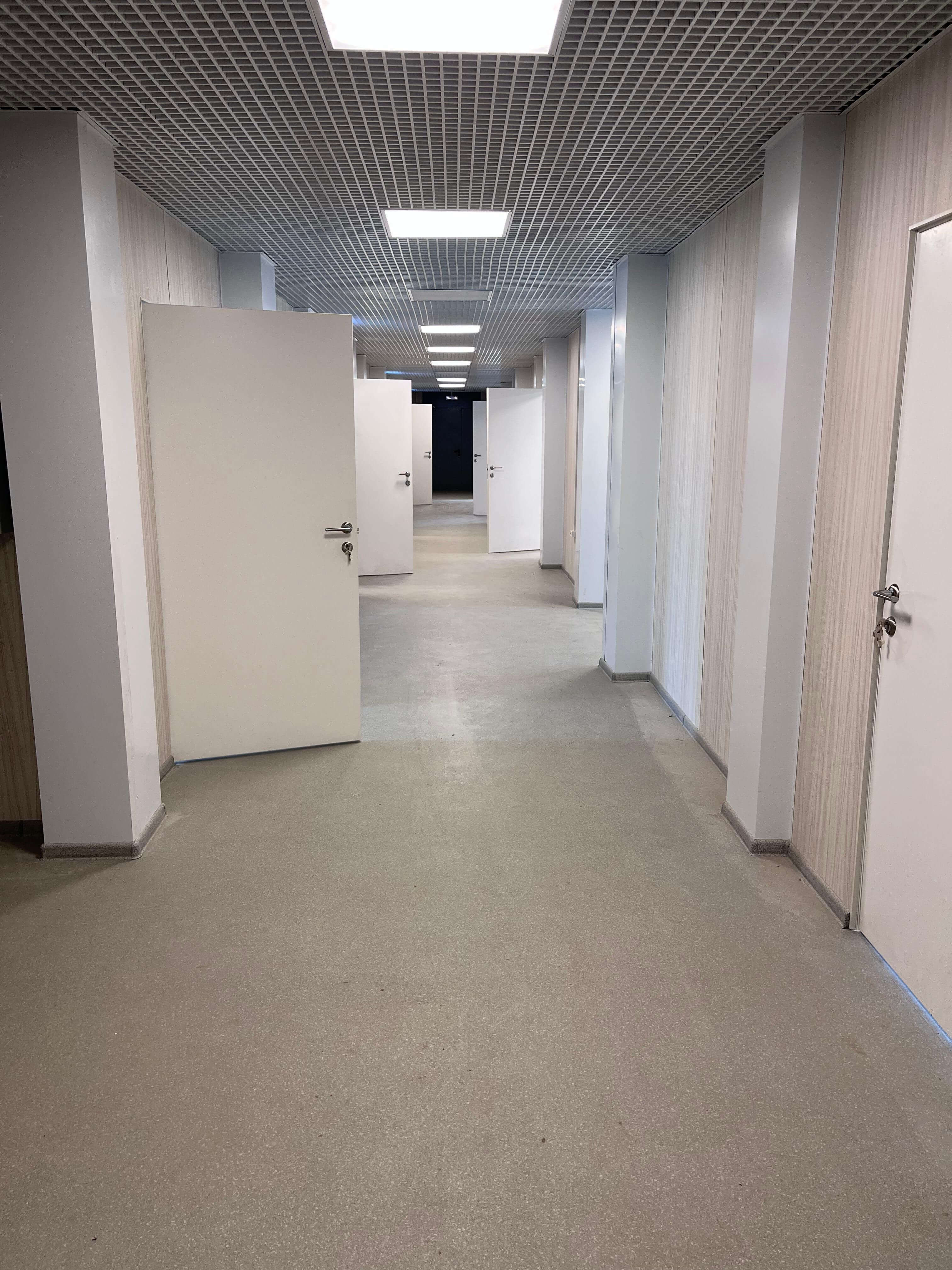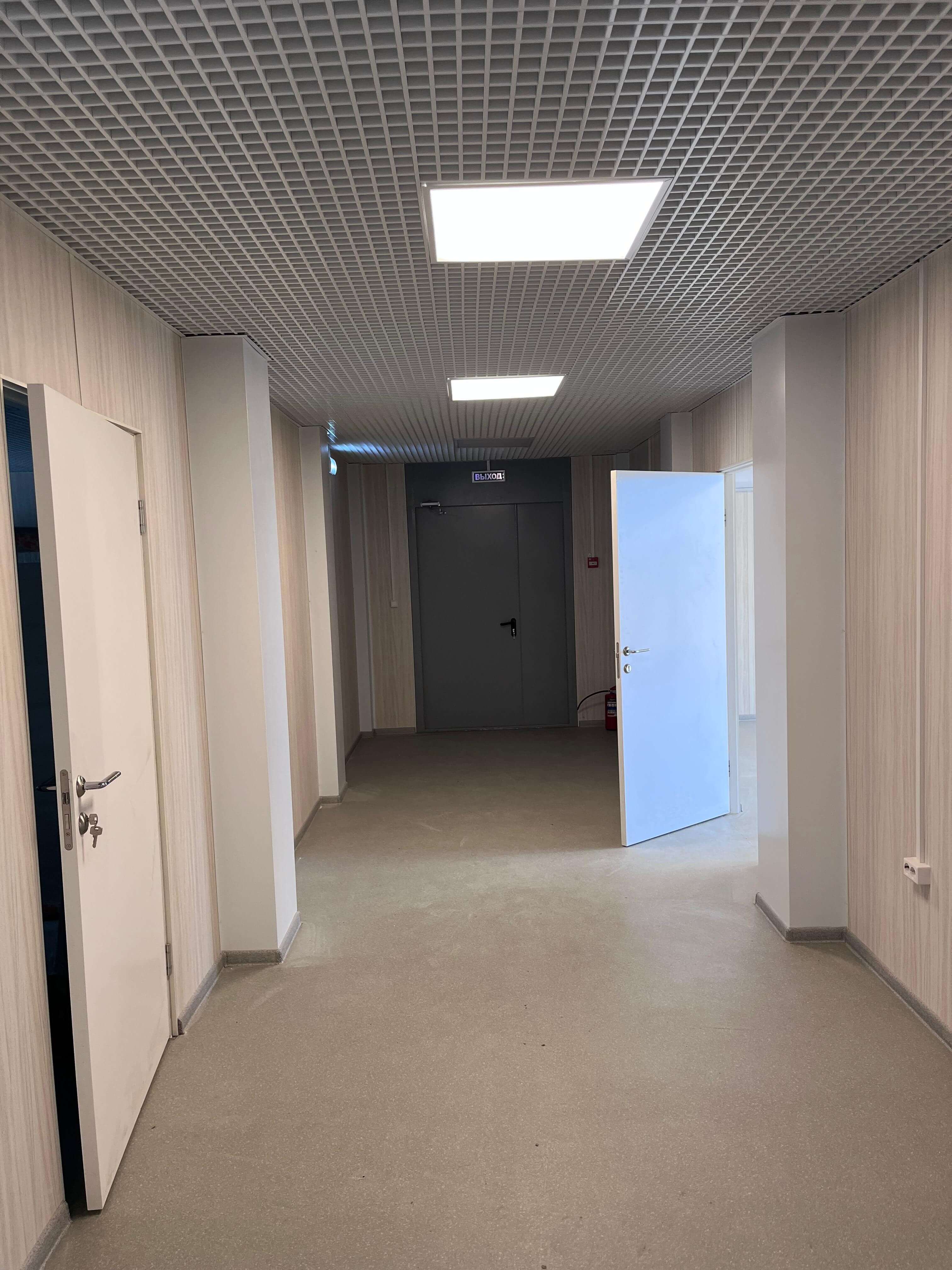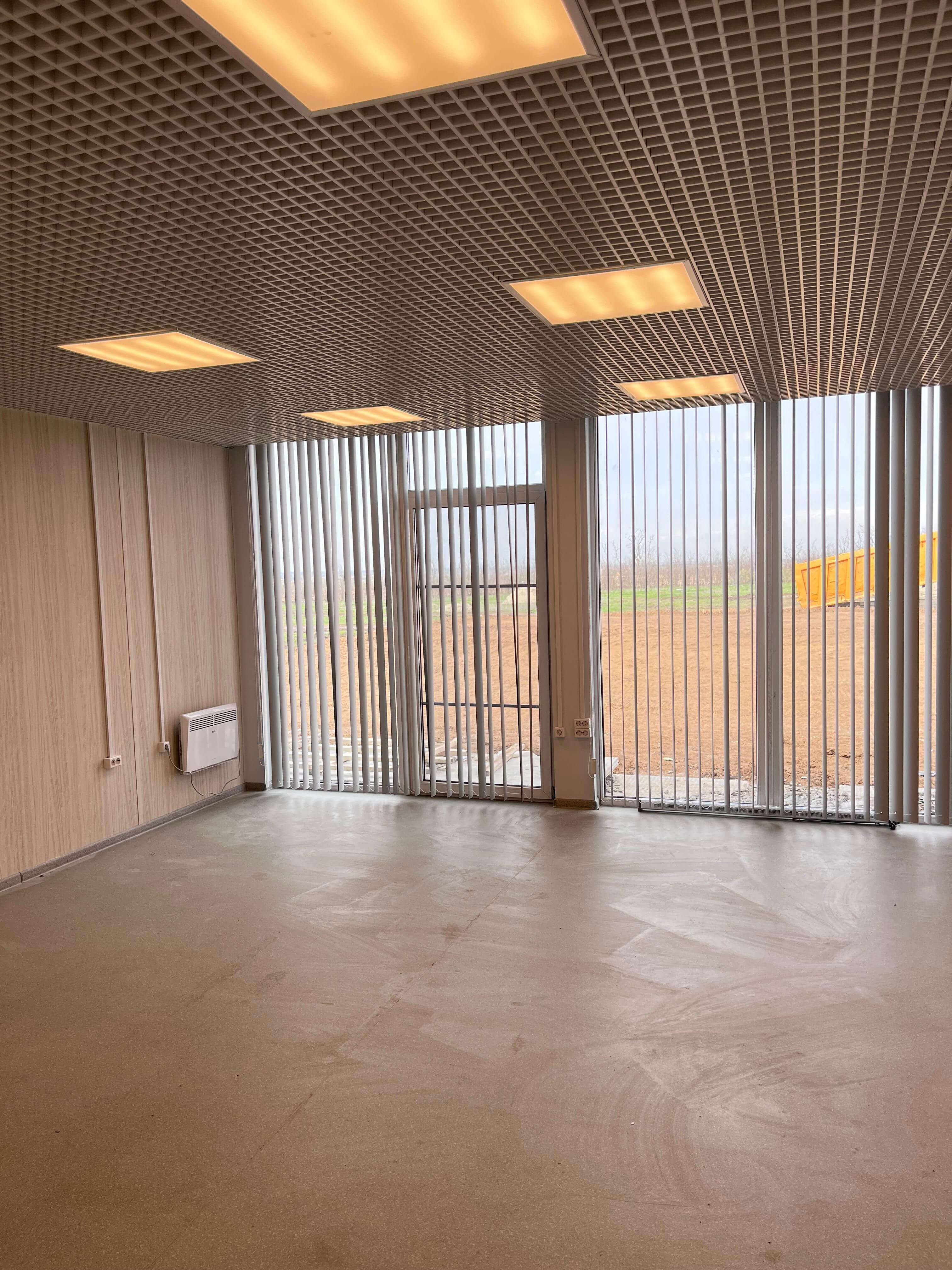 • Потолки: Установлена подвесная система «Грильято», обеспечивающая эргономичное размещение коммуникаций и равномерное освещение.
