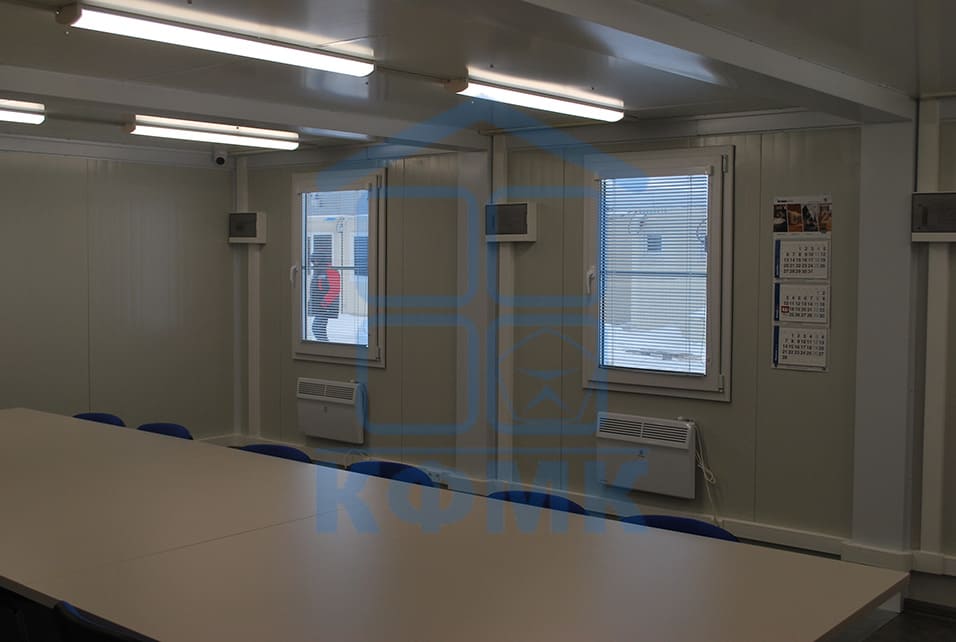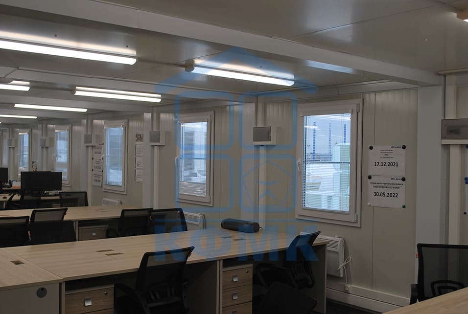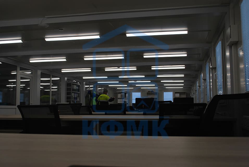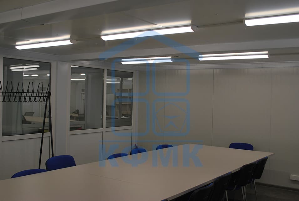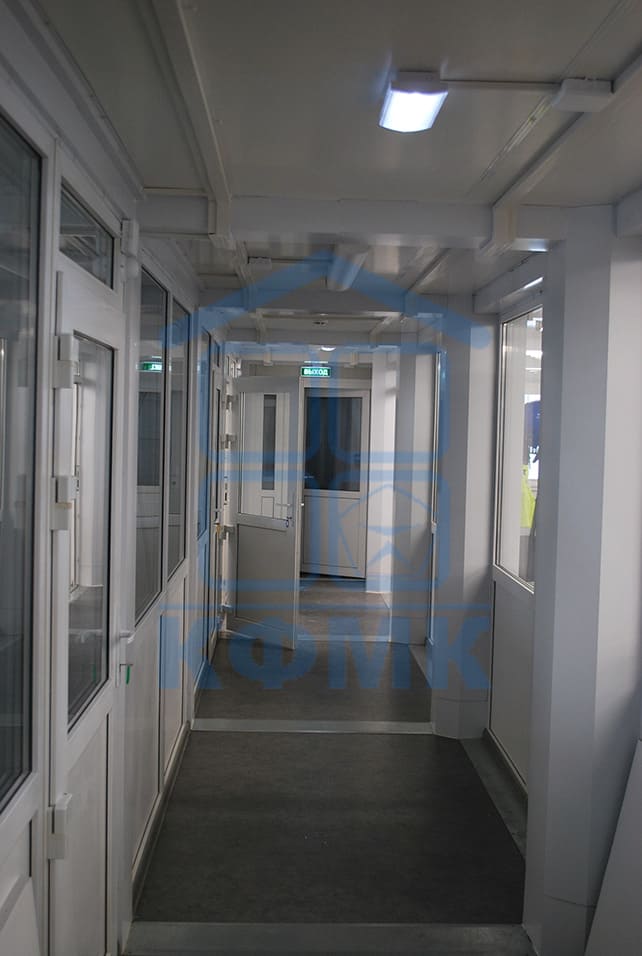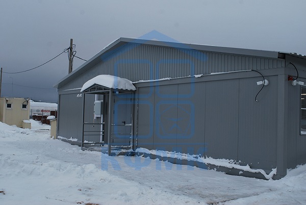 Модульное здание на базе 10 модулей 6055х2435х2770мм(в), 10 модулей 7325х2435х2770мм(в), с комплектом общей кровли и набором внутренних и внешних стеновых панелей.